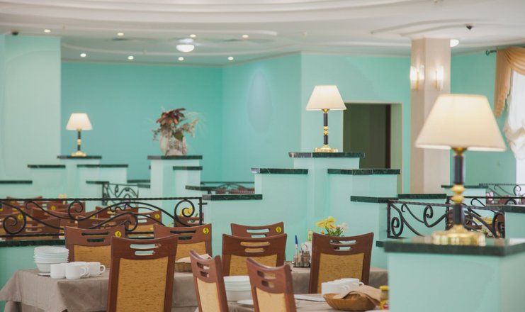 Столовая, с двумя уютными обеденными залами на 500 посадочных мест, расположена в главном корпусе санатория на втором этаже. В санатории организовано пятиразовое питание в одну смену, а для больных сахарным диабетом и лиц, нуждающихся в частом и дробном питании, предлагается дополнительный завтрак в 11:00 часов.